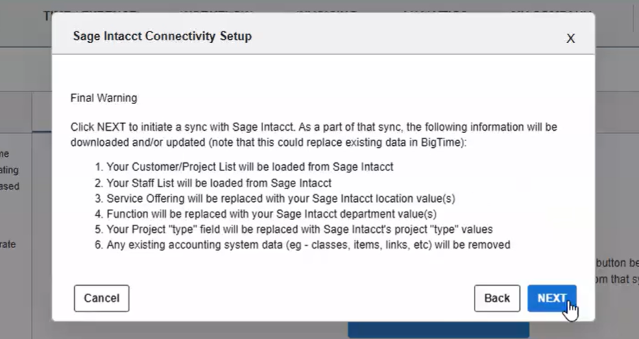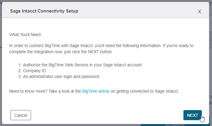Step 4. A window will populate letting you know that you'll need an admin login, admin password, and company ID. You'll also need to authorize BigTime in your Sage Intacct account. Click Next.