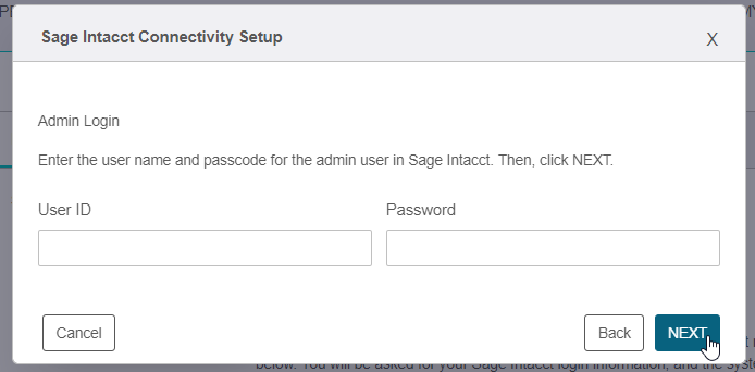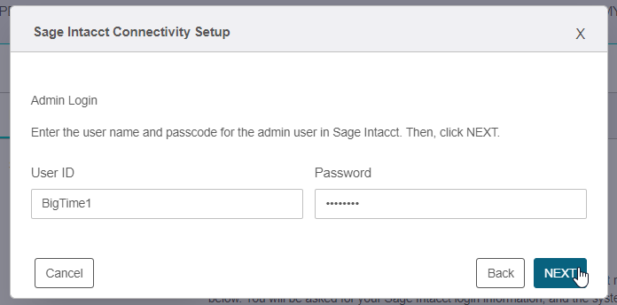 3. Enter your Sage Intacct Admin credentials (not the BigTime WS user).