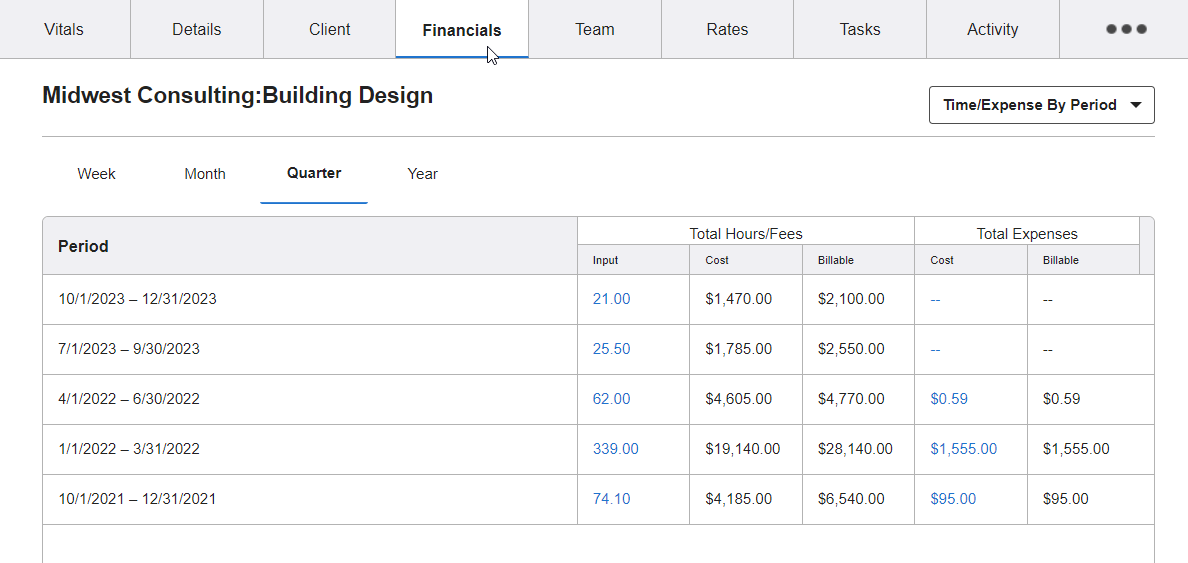 - Time/expense history—see the hours and expenses applied to this project at a weekly, monthly, quarterly, or yearly view.