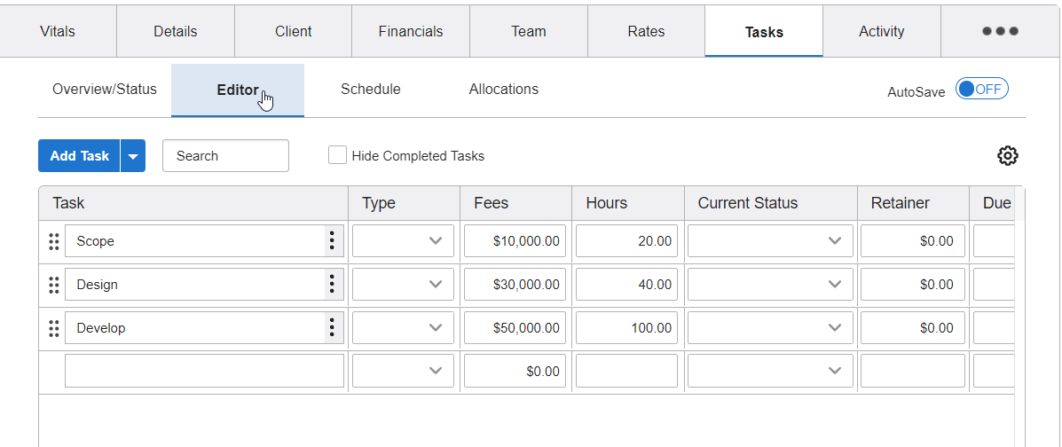 - Budget status—see hour and fee statuses for tasks at-a-glance.