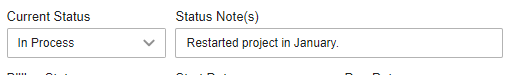 CURRENT STATUS describes the status of a project. Our project is IN PROCESS, as you can see in the image below, meaning we’re actively working on it. This status keeps the project “active” and on our project list.