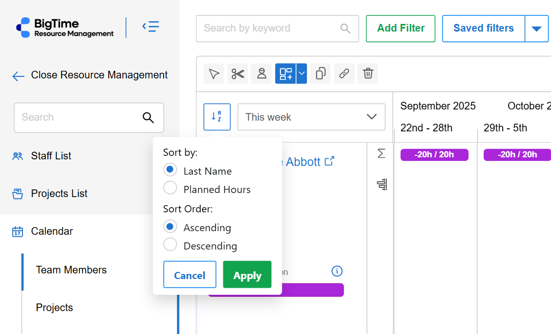 1. Filters: Apply Filters if needed. To learn more about how filtering in Resource Management works, go to the article: Using Filters in BigTime Resource Management