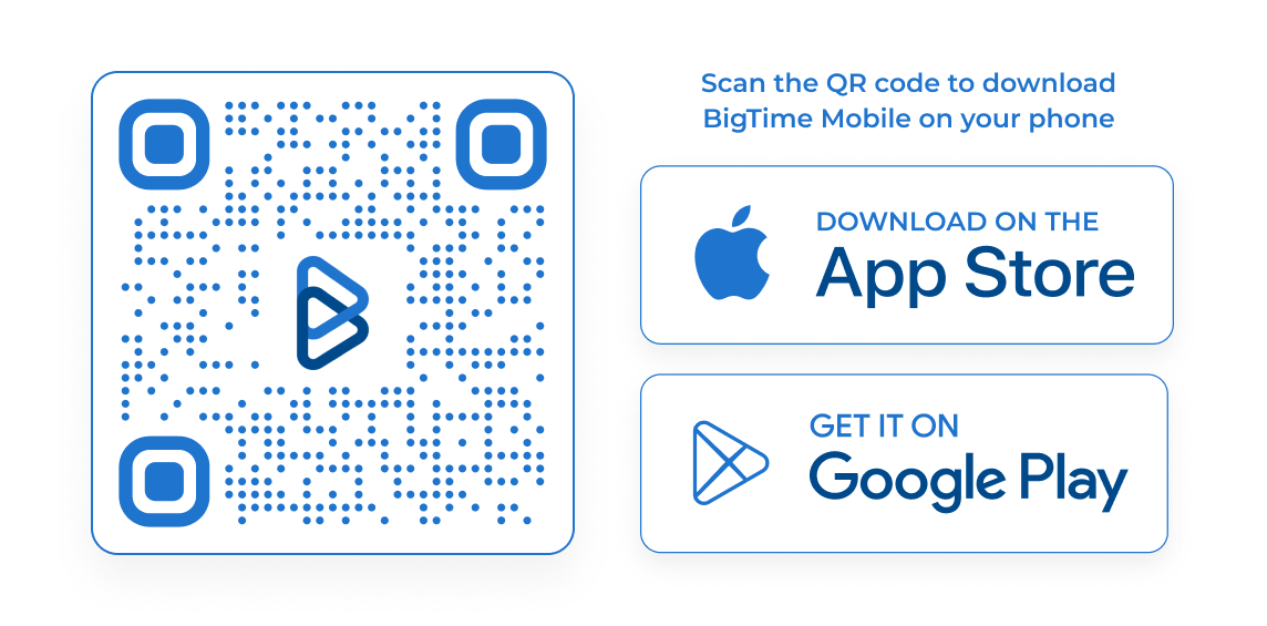 Search for “BigTime Mobile” on the Apple App store (iOS), or Google Play store (Android).