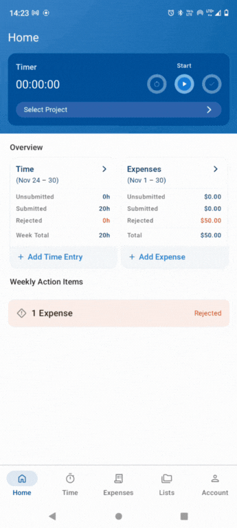 First, let's walk through editing and resubmitting a rejected time entry. Tap on that specific time entry on the main TIME screen, and you'll be taken to the editing module. You'll see a red notification at the top of this screen informing you why the time entry was rejected. Based on this information, you can make the appropriate changes, save your expense, and resubmit it like you'd submit a new time entry.