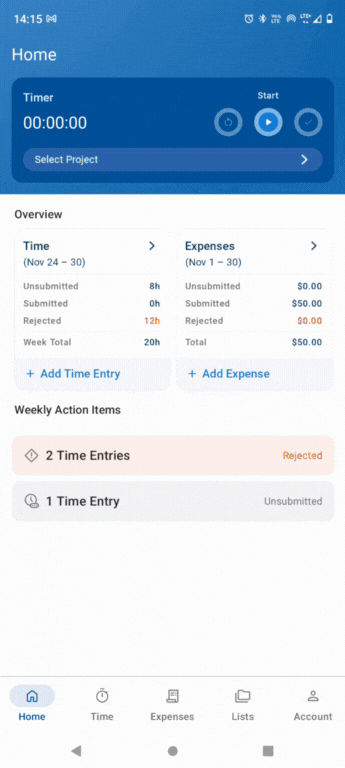 Just like in BigTime for desktop, you can use BigTime Mobile to submit timesheets or expenses for review by your manager or system administrator. Once you submit a timesheet/expense, it will be added to your manager’s pool of pending approvals, from which they can be either approved or rejected.