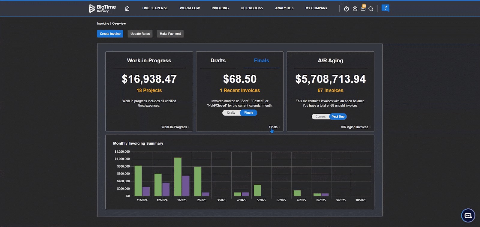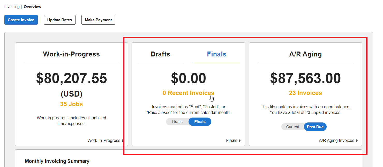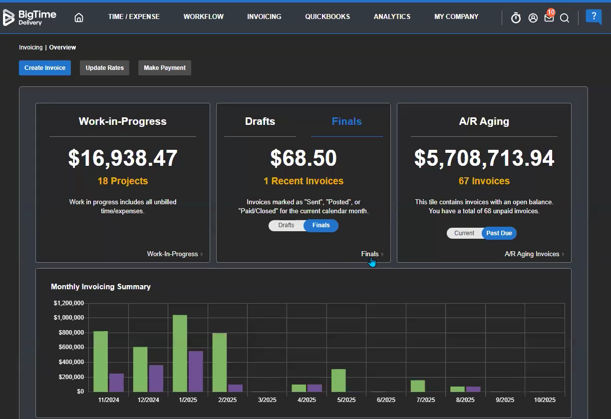 Step 1: Navigate to Invoicing > Overview, then click either the Finals or A/R Aging tile to locate the invoice you want to update. You can also flip that switch to change Finals to Drafts, and you can force mark paid within the Drafts page as well.