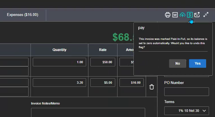 Step 3: In the upper-right corner of the invoice, click the ($) icon (Remove Payment Flag).