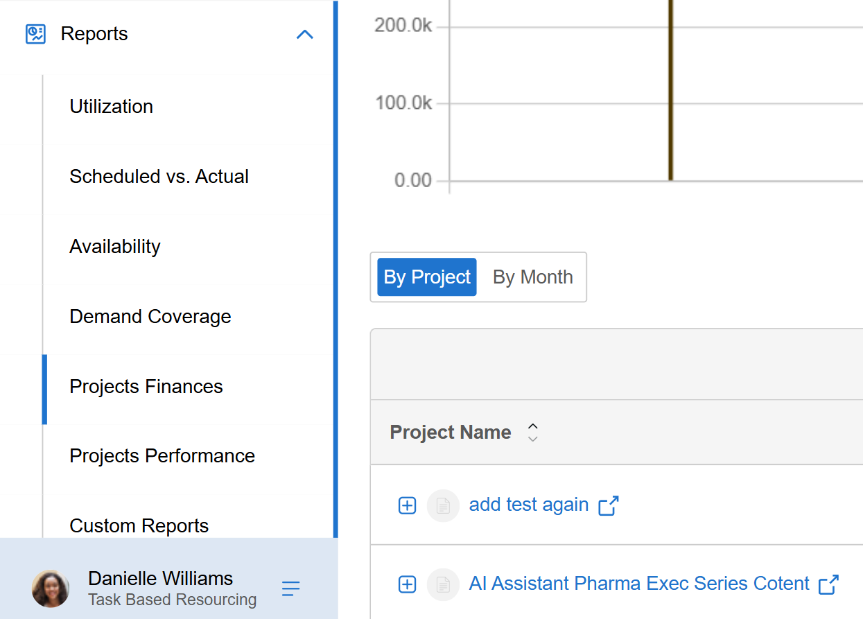 You can view project finances aggregated by project and by month.