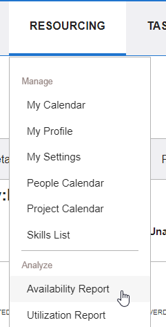 Click the RESOURCING navigation tab to open the Availability Report window from BigTime. Then, click AVAILABILITY REPORT.