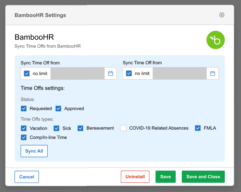 Click the Settings button and adjust the Time Offs you want to sync. The description of the Settings Modal is in the next section of this article. After setting up, click the SYNC ALL button and wait until all time off is synced into Resource Management. Your integration is now fully enabled, and you can quickly start syncing time off from BambooHR to Resource Management.