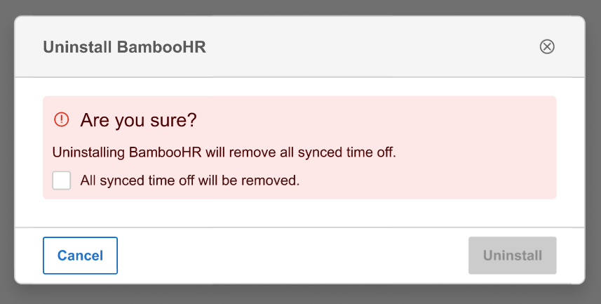 Log in to Administrator Role in Resource Management ▶ Go to the INTEGRATIONS Tab ▶ Find BambooHR Integration Tile ▶ Click the Settings Button ▶ Click the UNINSTALL Button in the Settings Modal