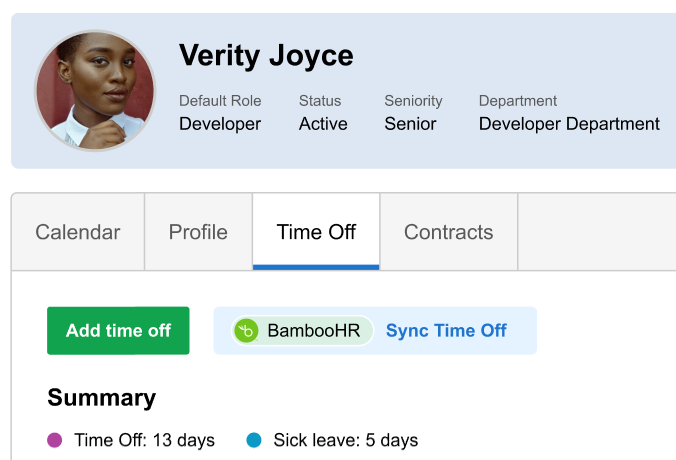 If you use BambooHR to manage time off, integrating it with Resource Management allows you to sync absences between the two platforms. You can easily sync all or only select time off categories available in BambooHR.Any recorded absences will lower a staffer’s capacity in Resource Management.