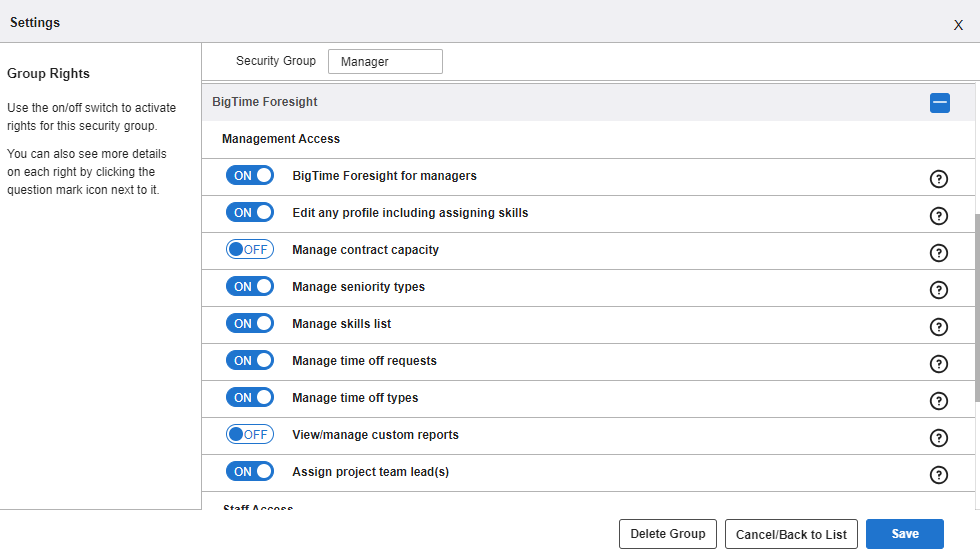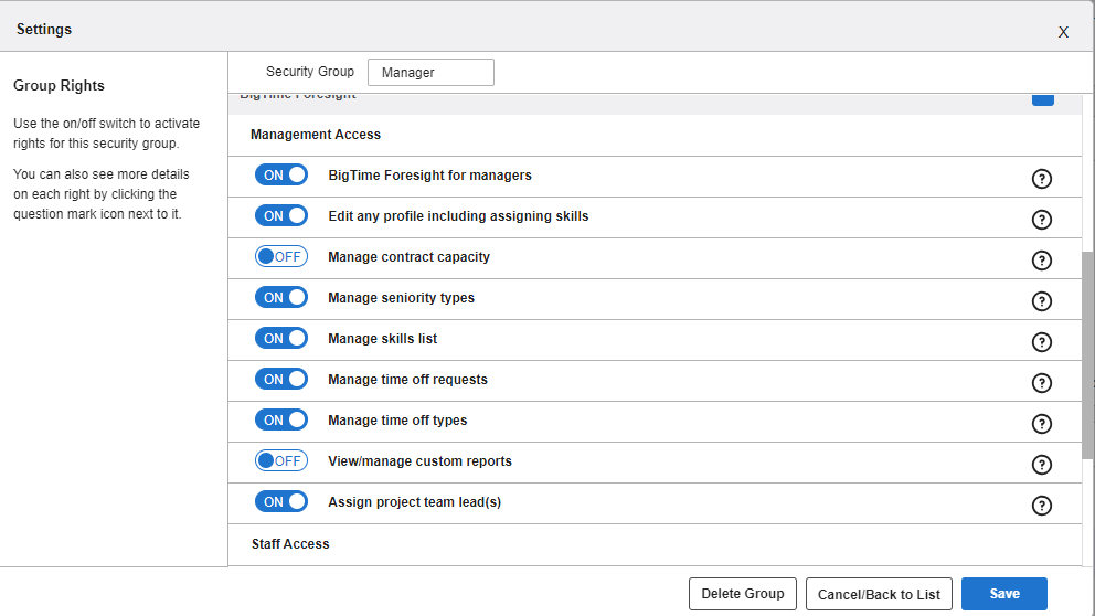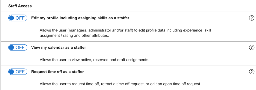 The Management Access rights discussed above give you power to make managerial decisions for your direct reports, but you won’t be able to make edits to some types of your own information unless you have additional Staff Access rights. For instance, if you have every Management Access right activated, you’ll be able to assign project team leads and approve time off requests submitted by staffers who report to you. However, you won’t be able to submit your own time off requests, assign yourself skills, or view your own time off calendar unless you also have the corresponding Staff Access permissions. If you want to grant administrators, managers or staffers the ability to edit their own details, these are the user rights they’ll need to have.
