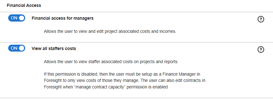 This permission lets a user view all staffer’s associated costs on projects and reports in Resource Management. A user who has this permission and the “Manage contract capacity” user right turned on can edit contracts for any staffer in Resource Management. If you want to grant a staffer the ability to view cost information for only the staffers they manage, you can do so by setting them up as a Finance Manager and leaving this user right off.