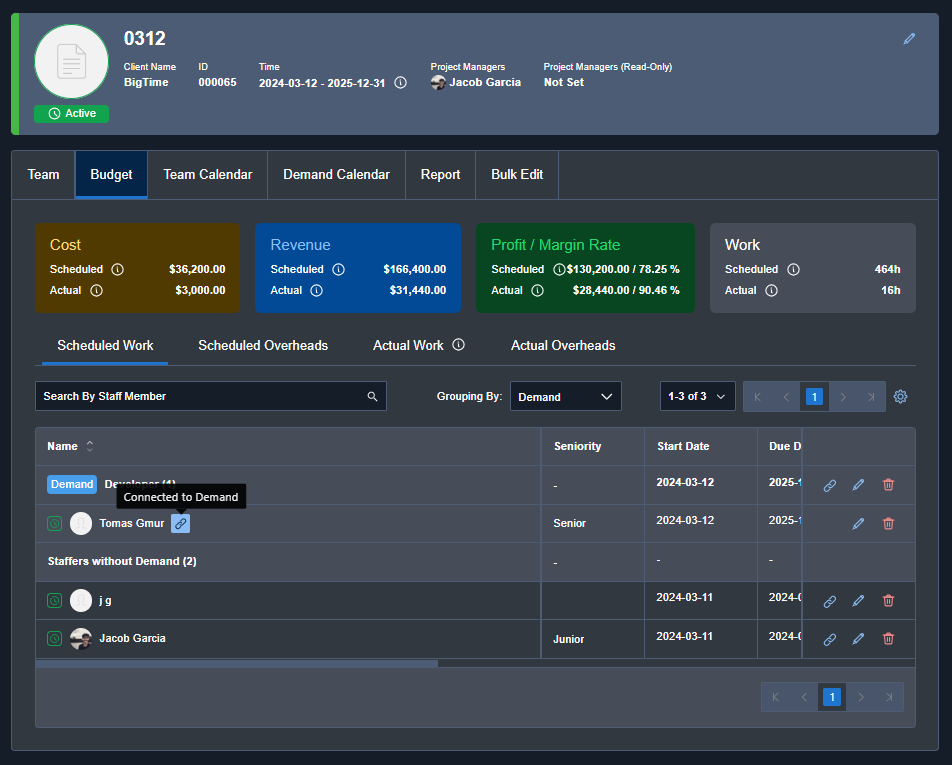 Additionally, the system will display a LINK button next to the staffer’s name to let you know that the assignment is already connected to the demand: