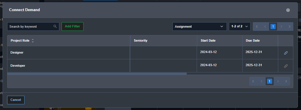 In Resource Management, you can connect an assignment to one demand in several places. Below is a list of locations across the system and flows: