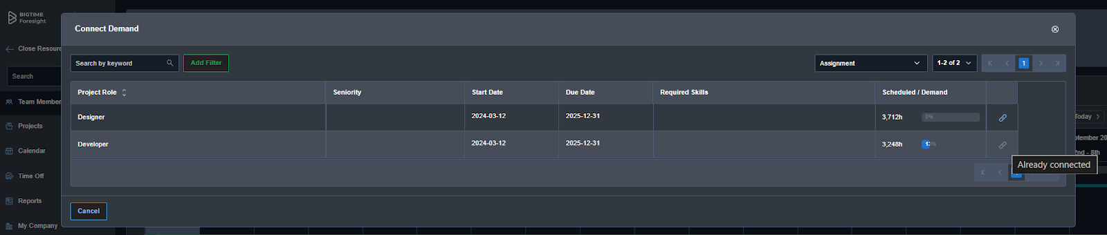2. A single-selection list will open. Select the demand you want to connect to a given assignment. Click the CONNECT DEMAND button on the right: