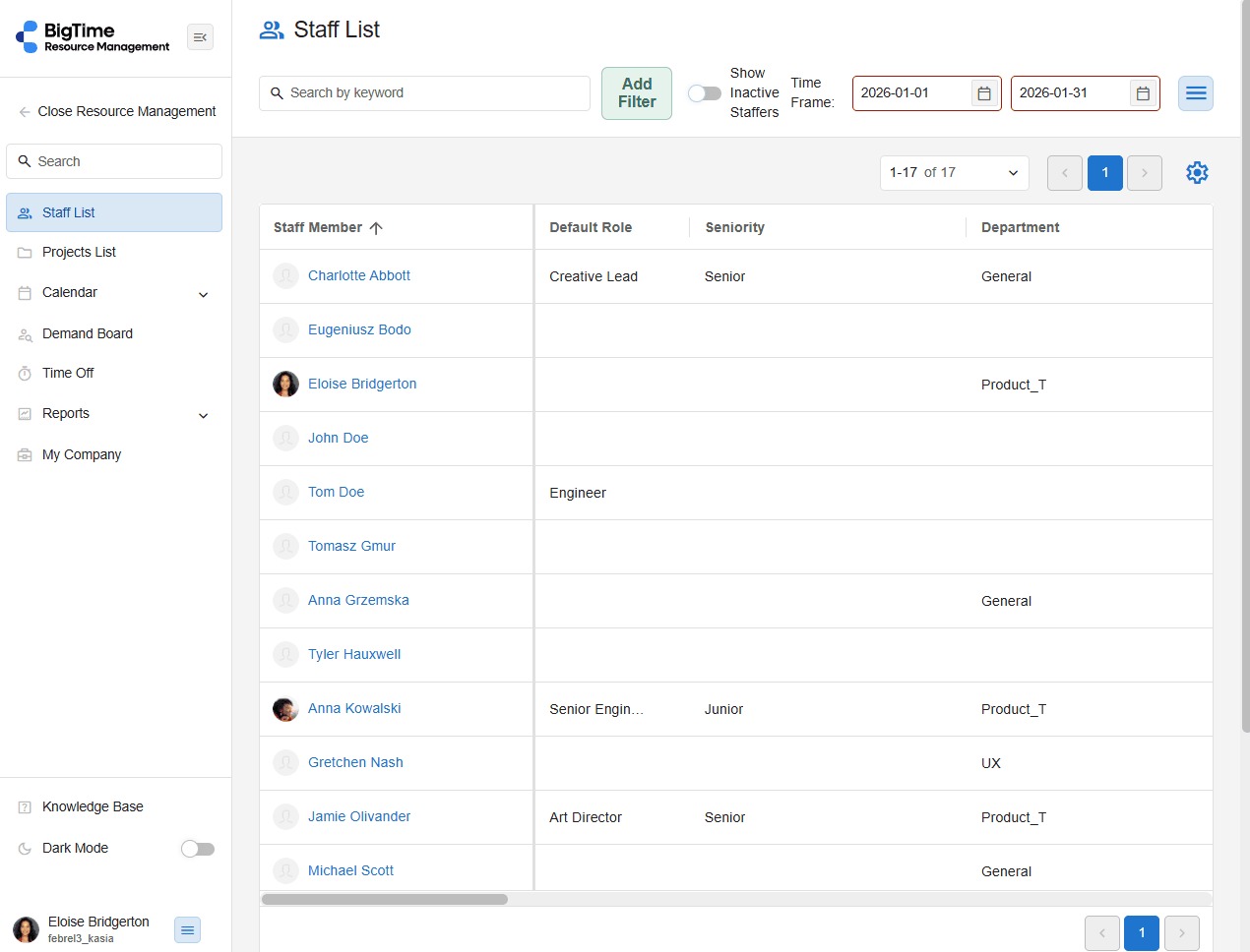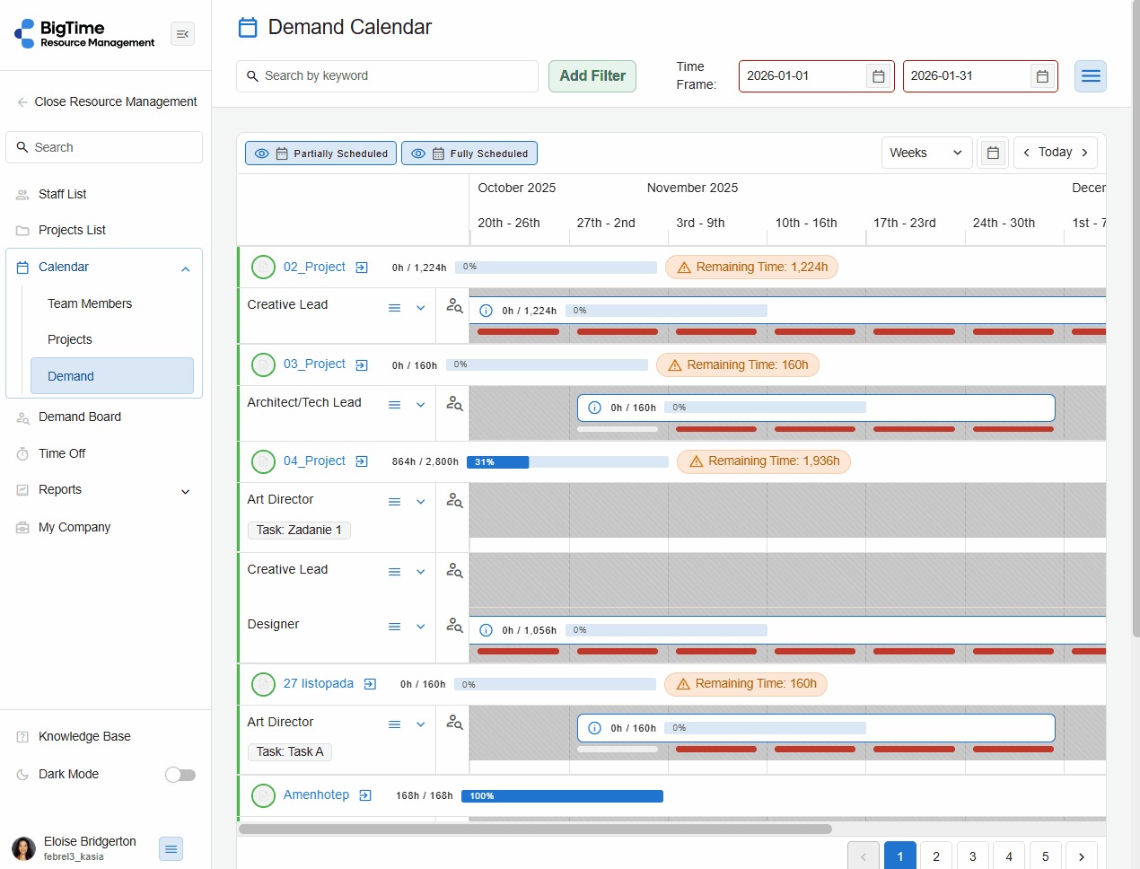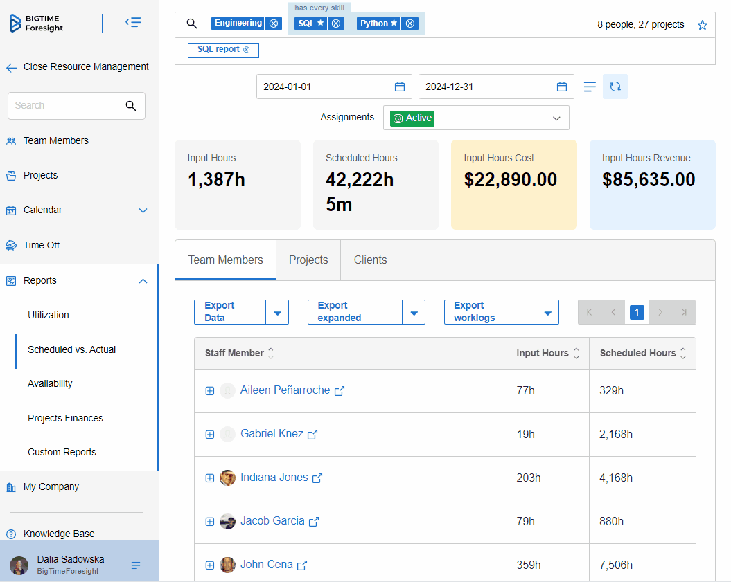 Please remember that depending on the specific line regarding a single assignment, staffer, time entry, client, or project, the data is calculated accordingly based on logs related to a given object in the system.