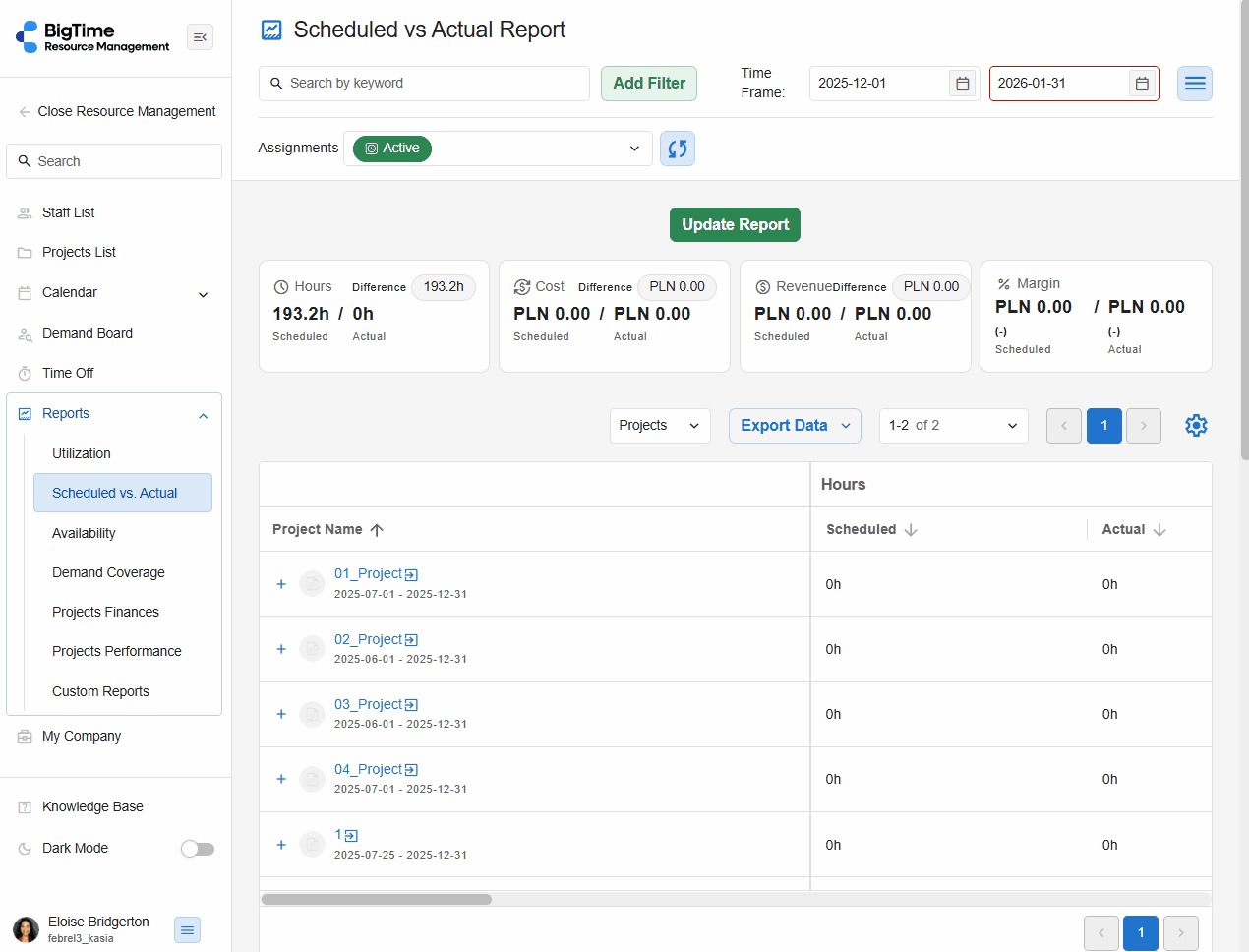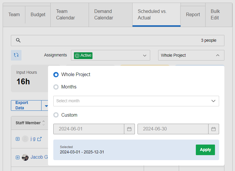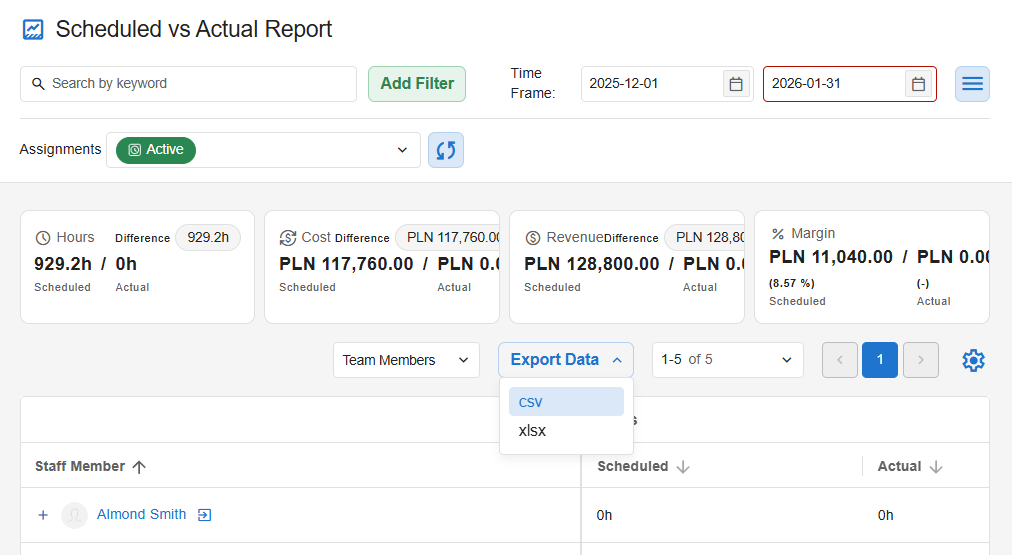 The Scheduled Vs. Actual report will show how your staffers used their time and how that compares to their submitted working time. This will help you with future work planning and better financial management. In this article, you'll learn the information on Scheduled Vs. Actual report provides you, and which formulas are covered under the data.