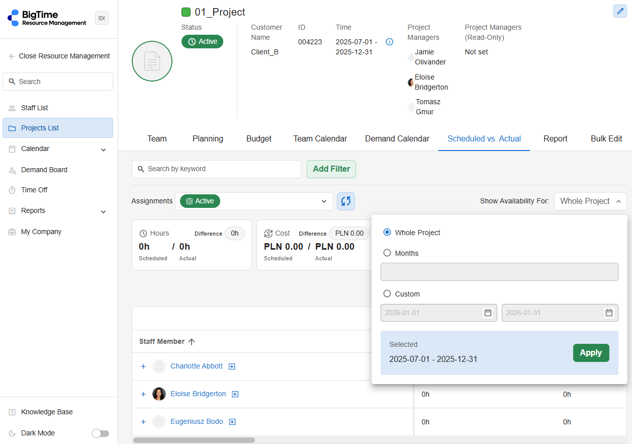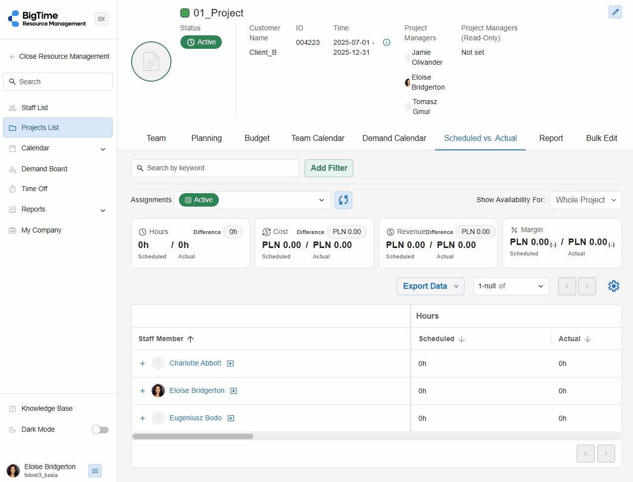 Resource Management is a tool that stores a lot of financial data that should not necessarily be available to all company managers. Therefore, we allow users to manage permissions for specific data appropriately. You can read more about it in the article linked above. Because the Scheduled vs. Actual report provides a lot of financial data, its visibility and the range of indicators will vary depending on the user's permissions. You can check specific use cases in the table below based on permission variations.