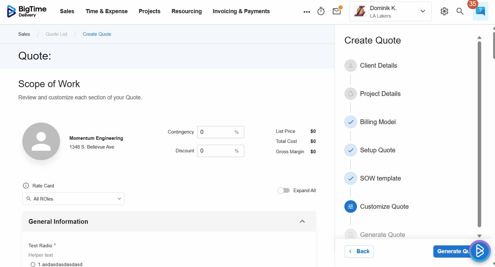 - Add staff roles and rates using your BigTime data to build your Quote