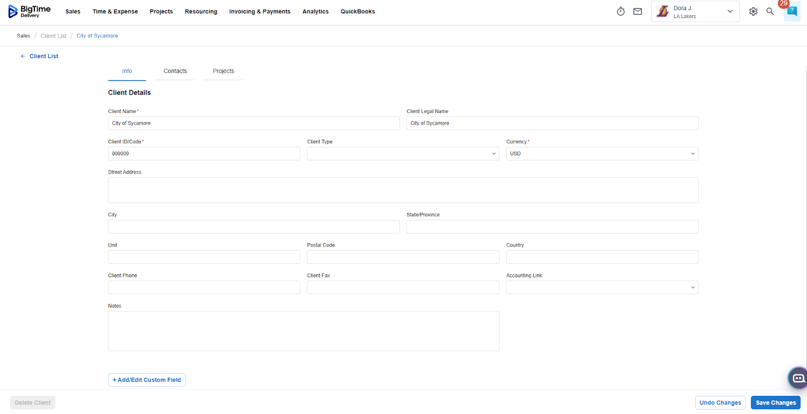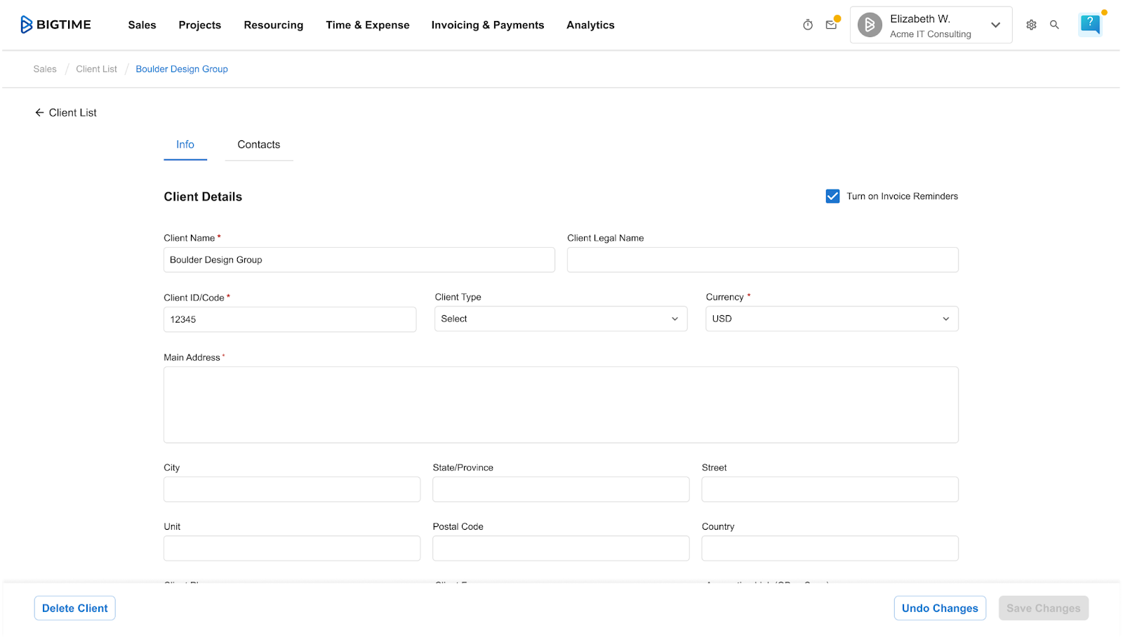 After making edits, click Save Changes at the bottom right of the screen. Your updates will be immediately reflected across all related areas in BigTime.