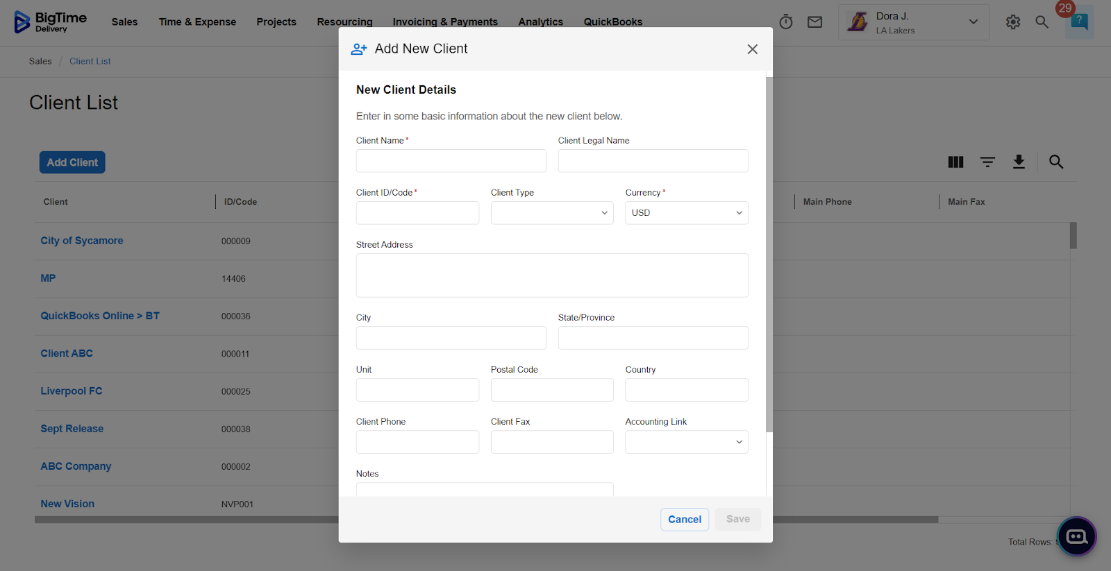 - Client Info: Add or update legal name, type, address, custom fields, currency, and notes (see the screenshot above in Adding a New Client, Step 4.).