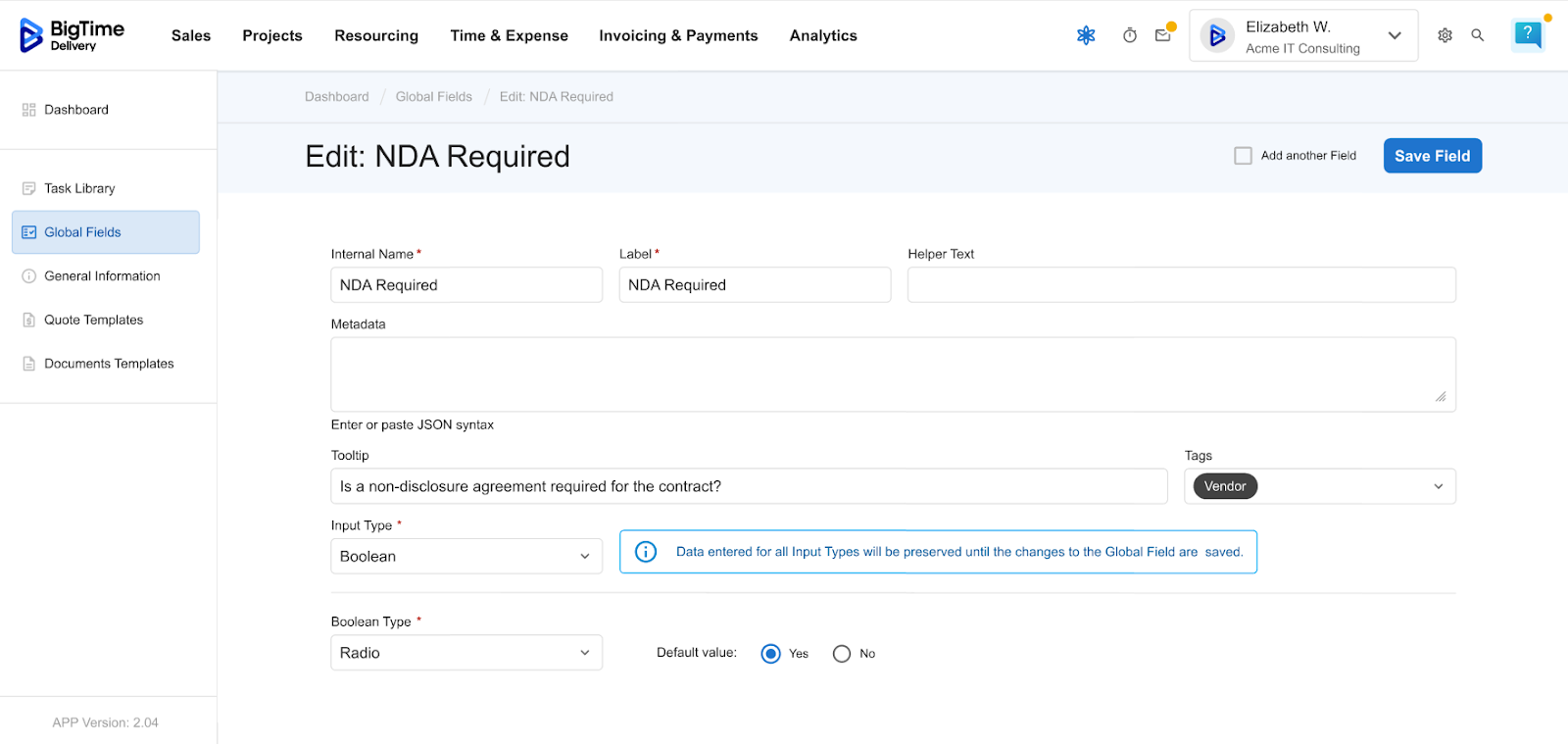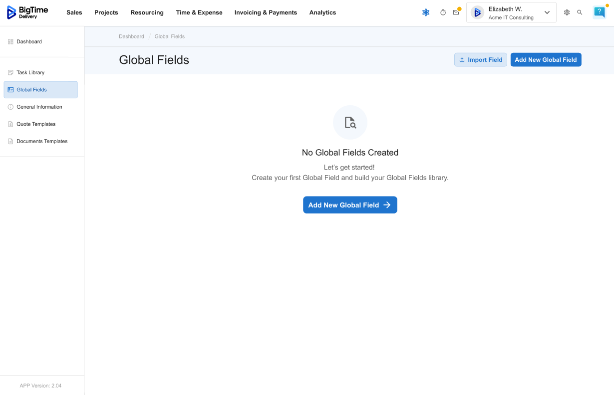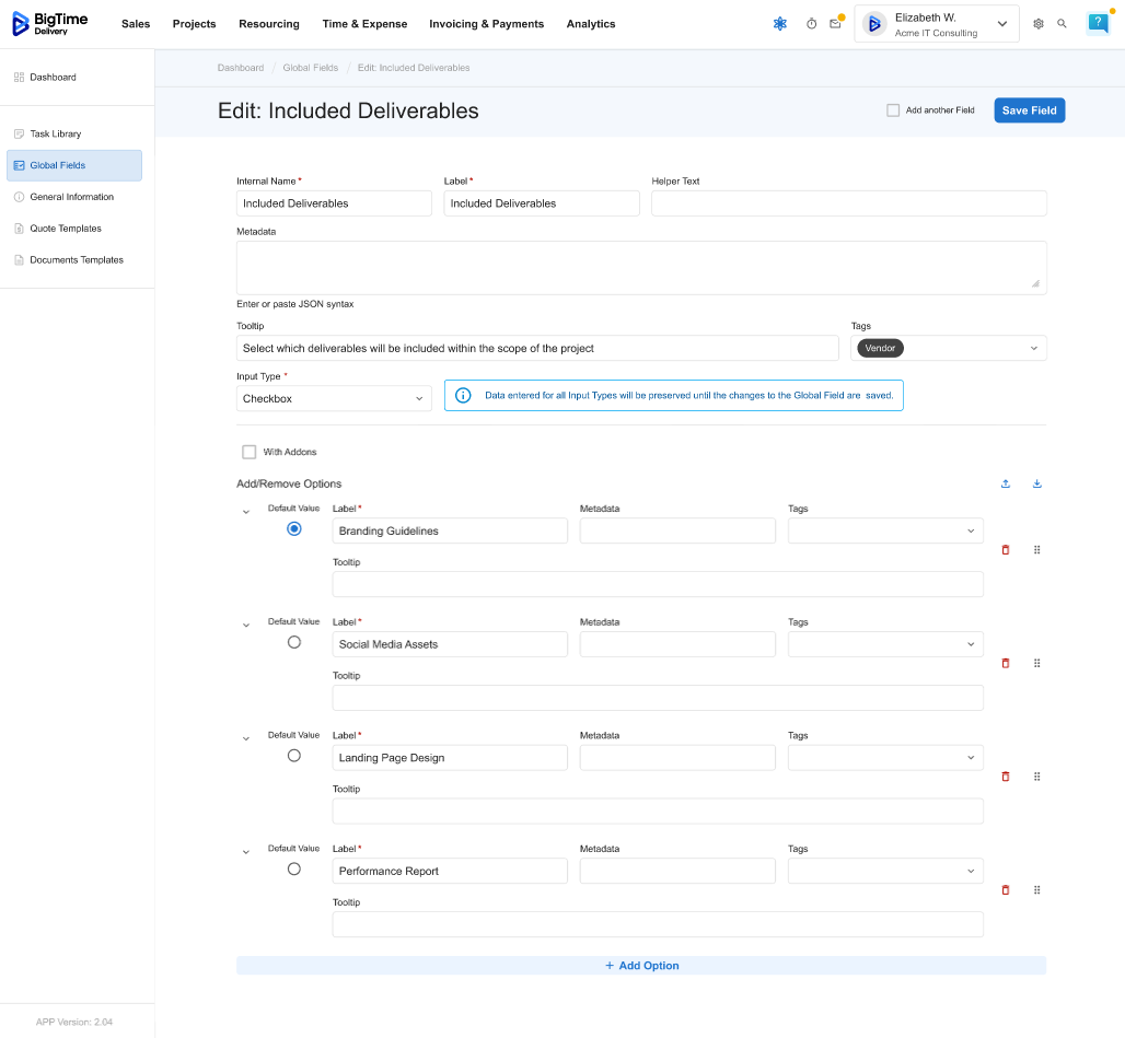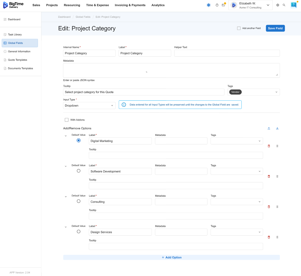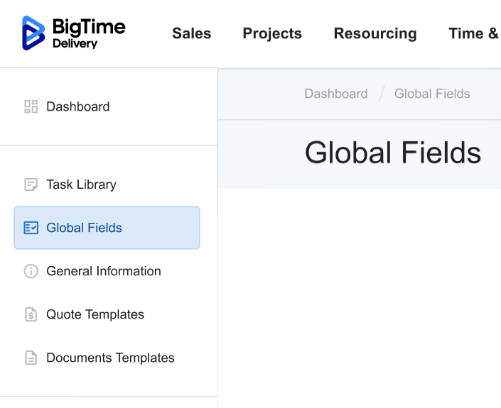Managing Global Fields is a feature available to administrators in BigTime Quotes. Only users with appropriate permissions can view or edit global attributes that apply across Tasks, Templates, or Quotes.
