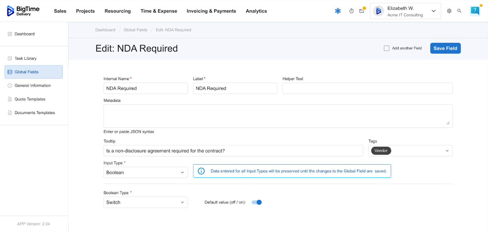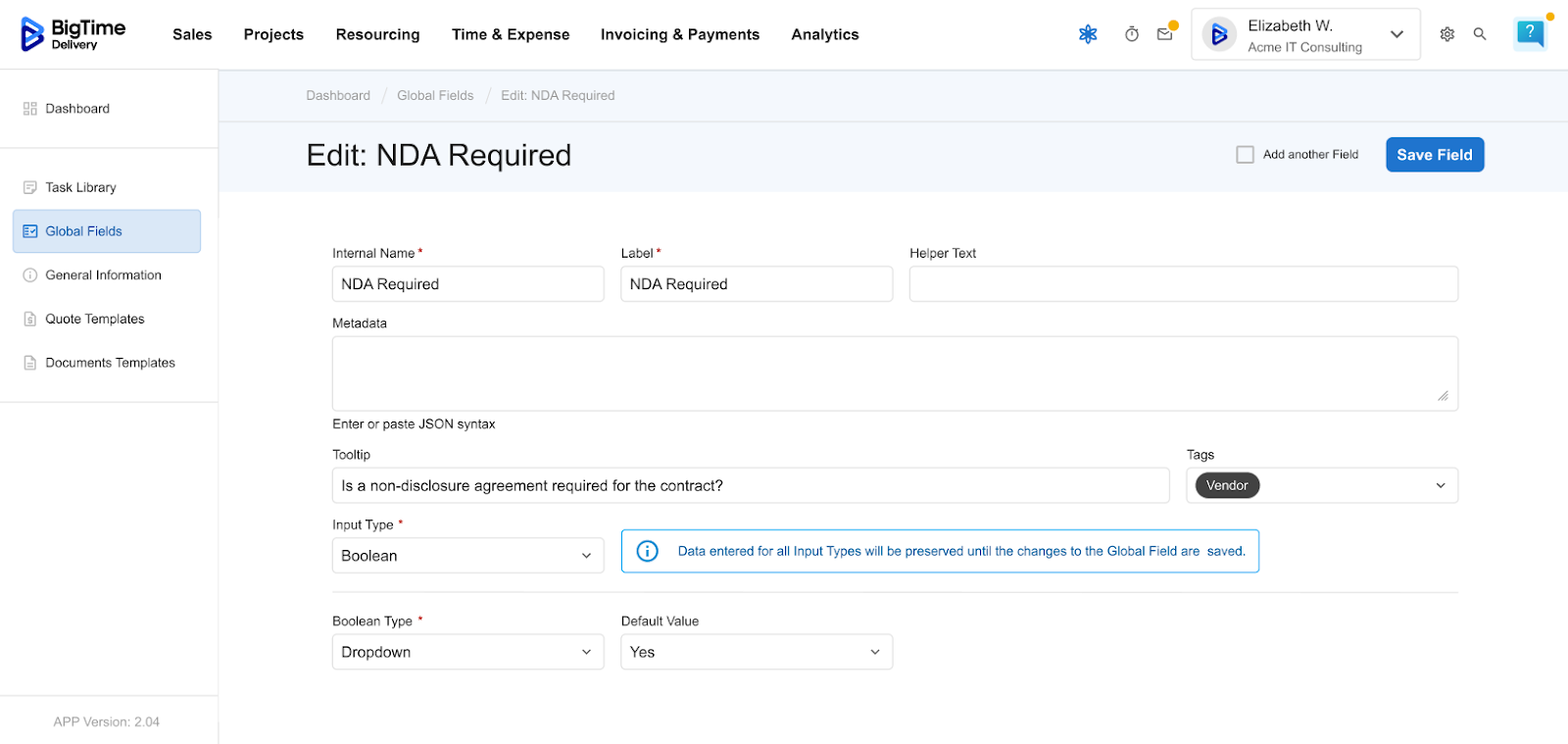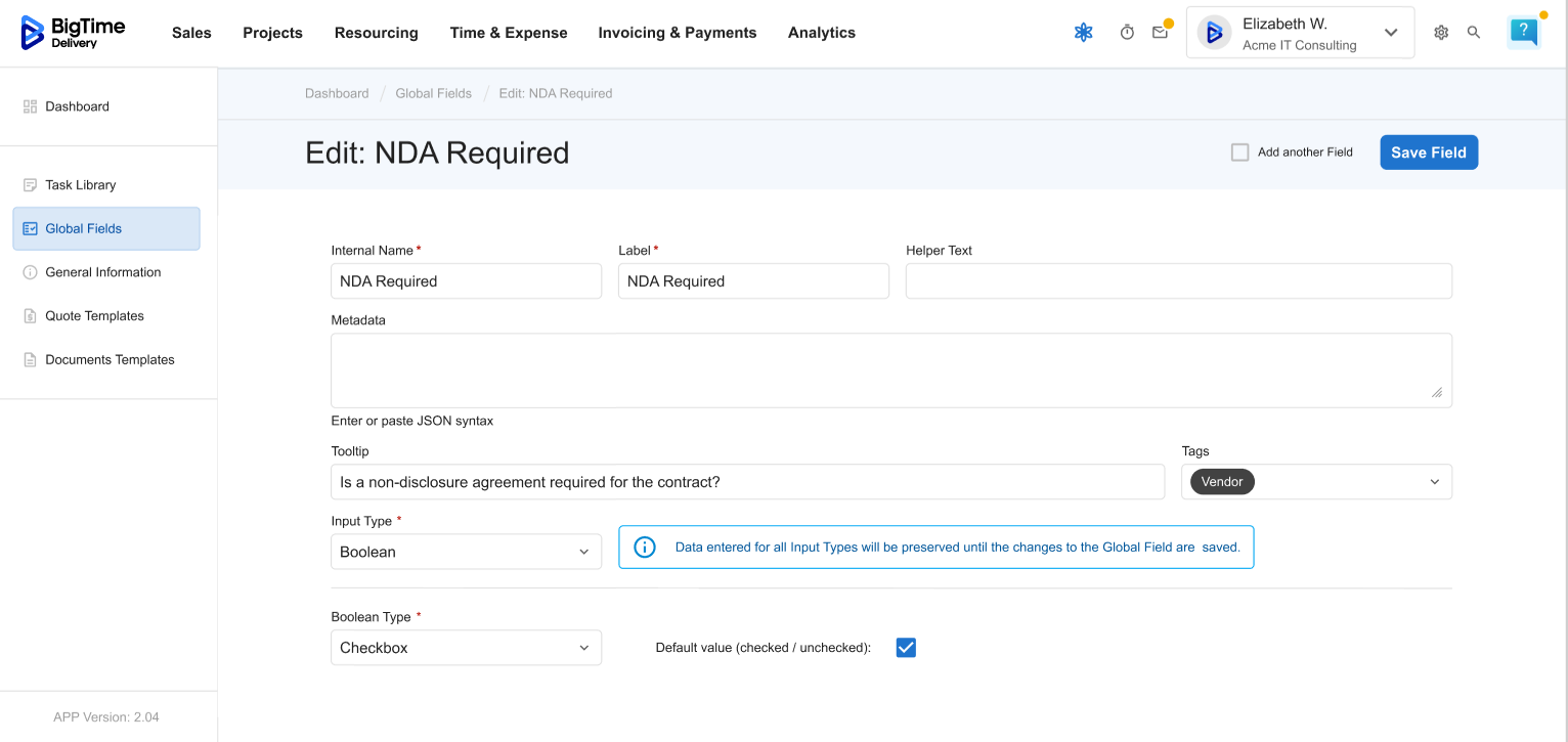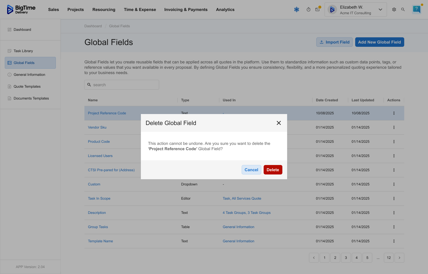 Managing Global Fields is a feature available to administrators in BigTime Quotes. Only users with appropriate permissions can view or edit global attributes that apply across Tasks, Templates, or Quotes.