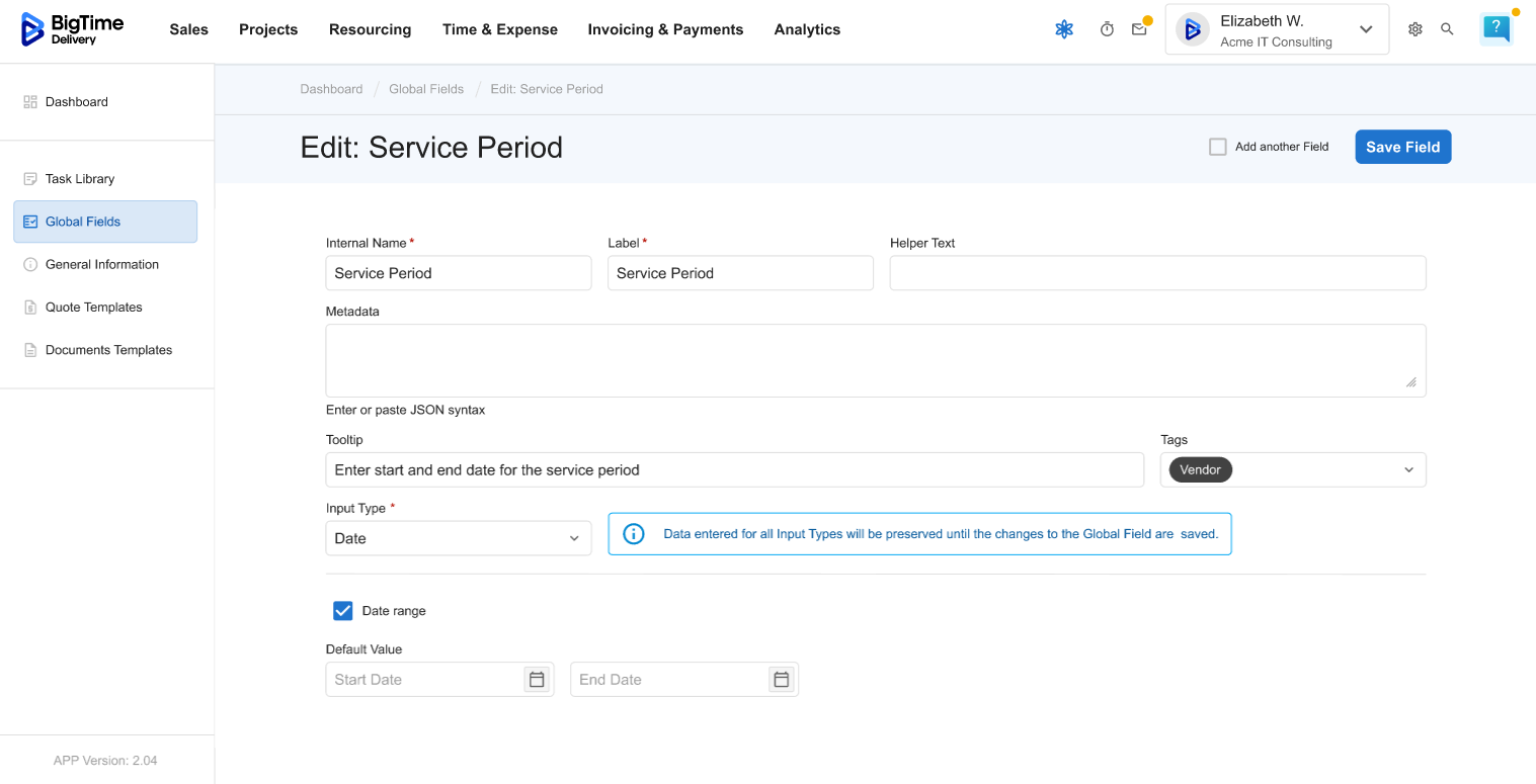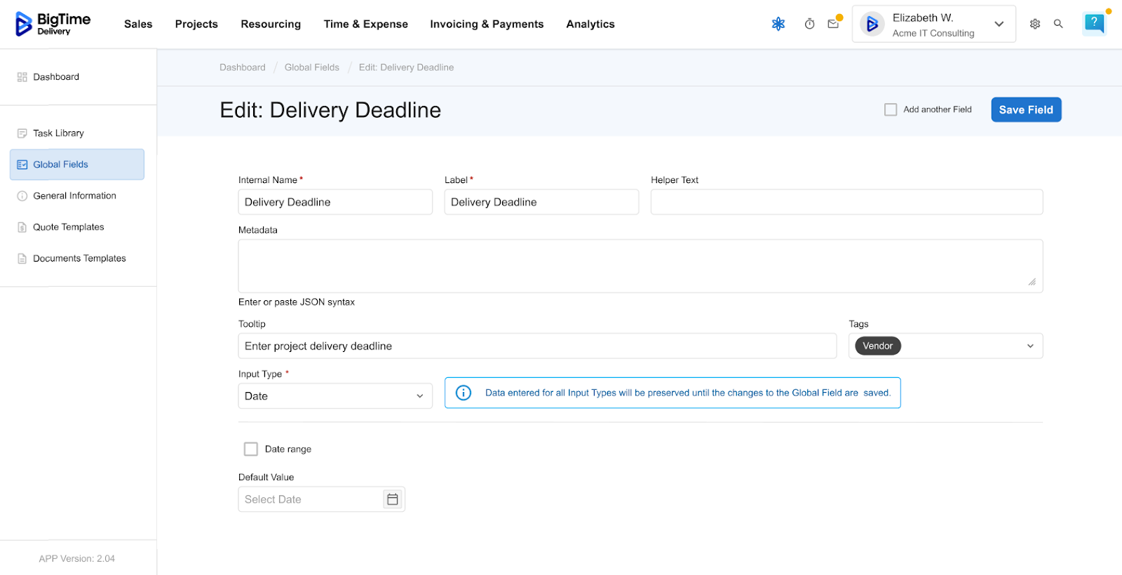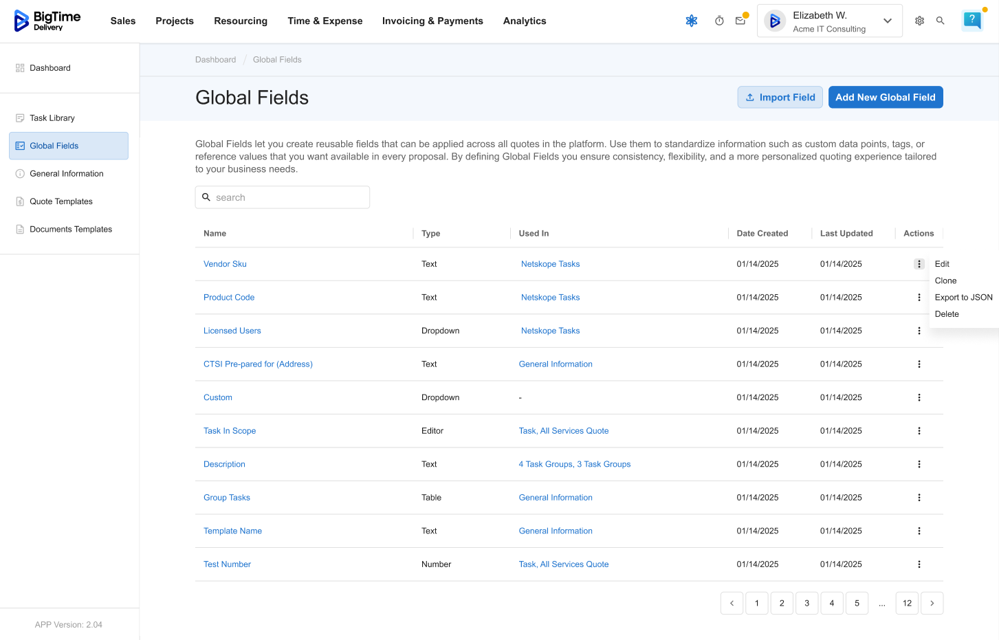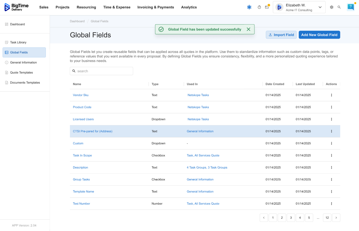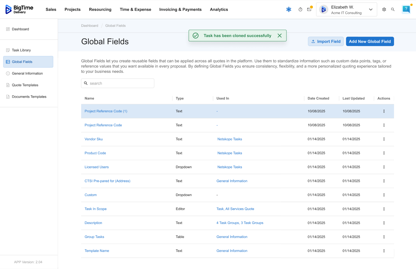 Global Fields let your organization create reusable data points that appear across multiple areas of BigTime Quotes — including Tasks, Project Templates, and Quotes themselves. They serve as consistent reference fields that capture key business information, such as billing details, service categories, or delivery timelines.