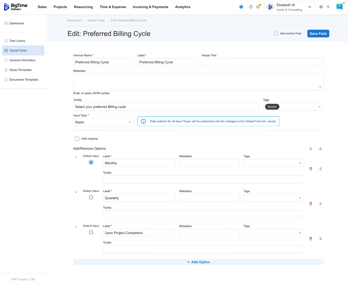 Follow the steps below to create a Radio field. Use this type when you want users to pick exactly one visible option, such as Billing Frequency or Engagement Model.