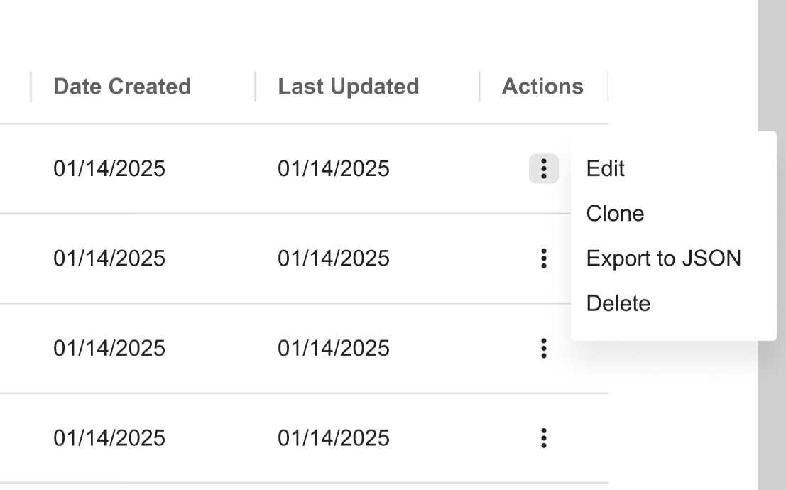 - Action – A three-dot menu that lets you manage each field. From here, you can edit, clone, export, or delete the selected field.