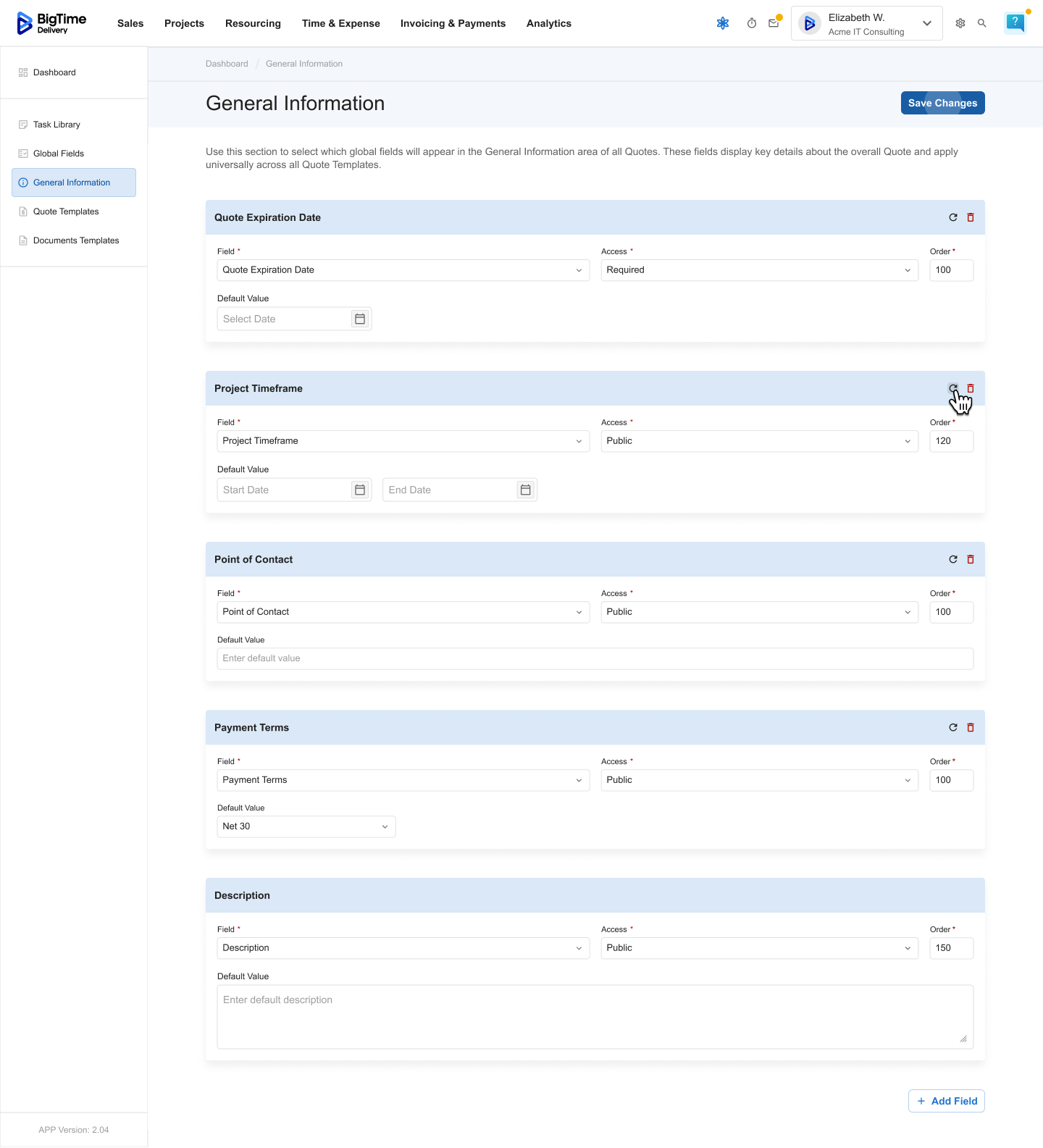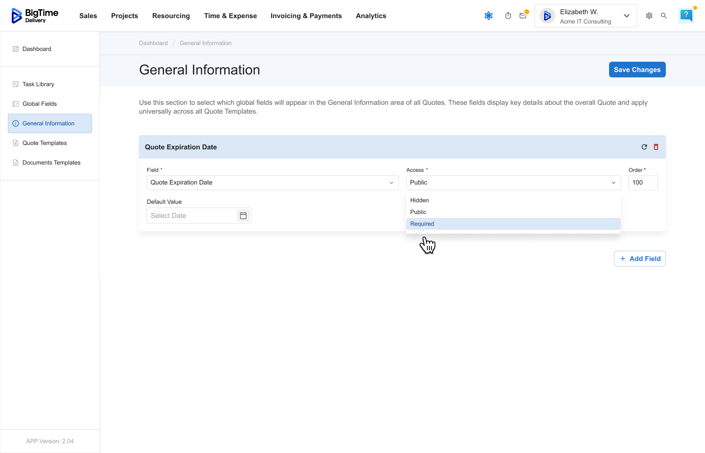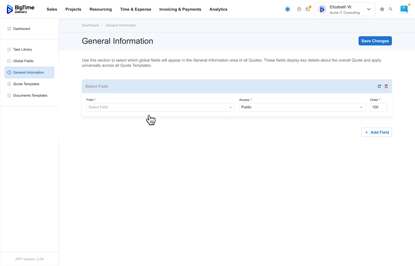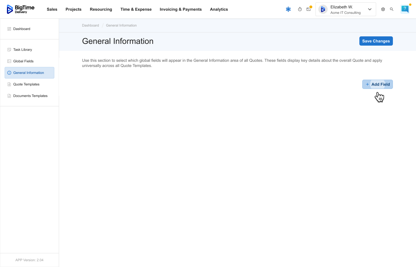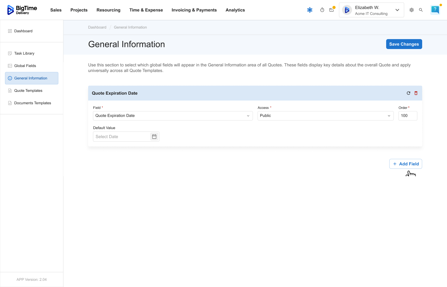 Managing General Information is an admin-level feature within BigTime Quotes. Only users with the right permissions can edit or configure which fields appear in this section.