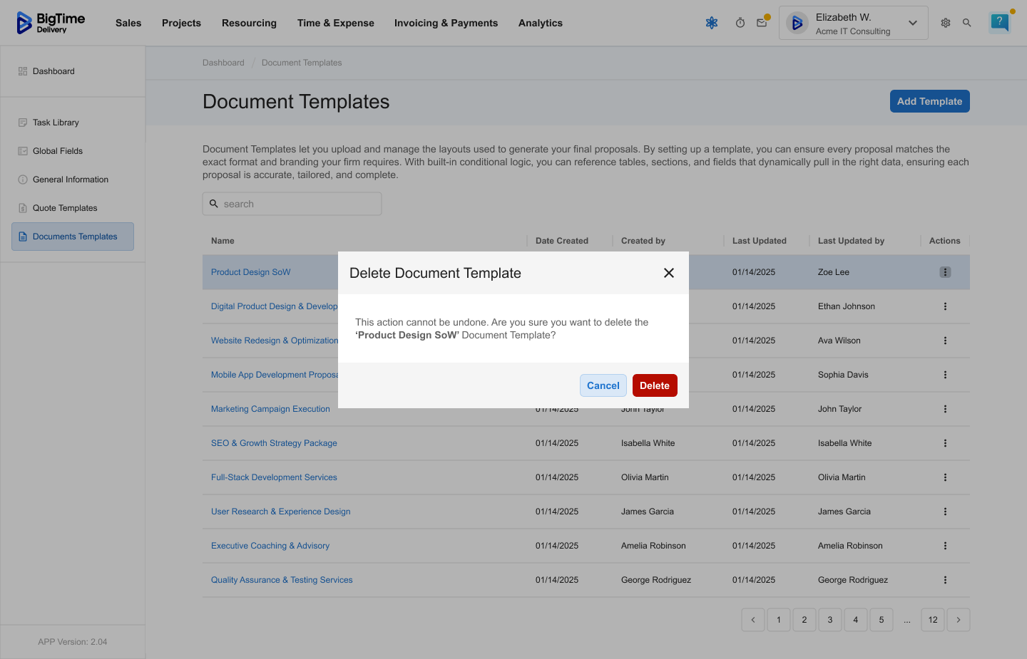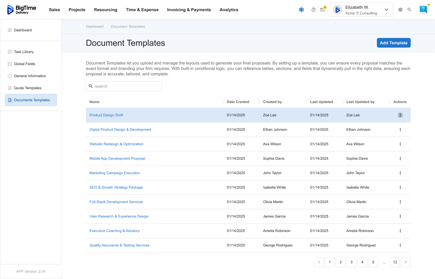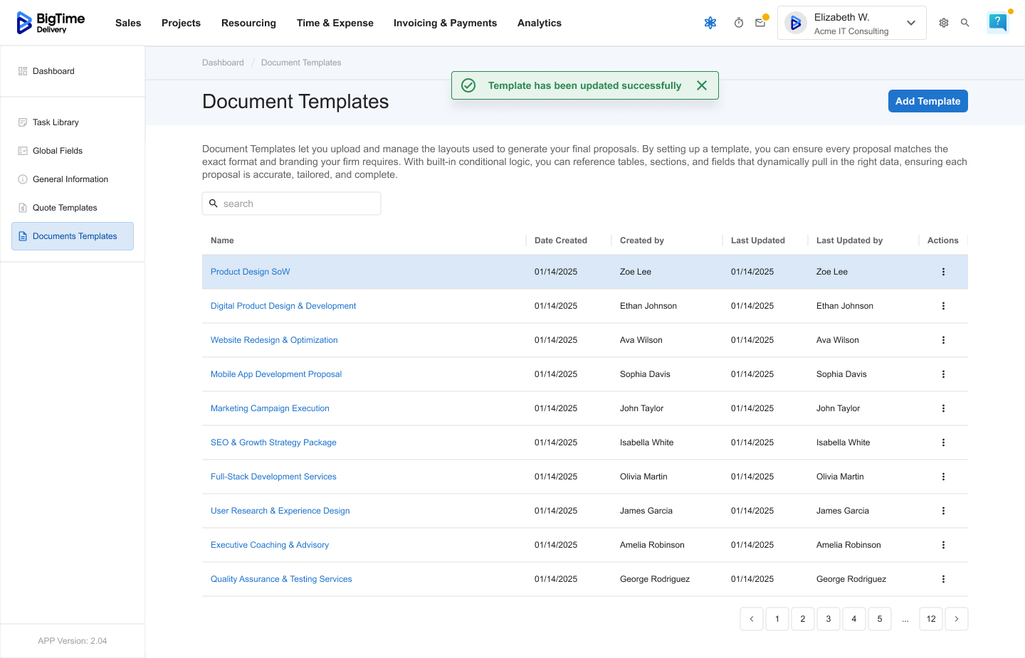 Managing Document Templates is an admin-level feature in BigTime Quotes. Only users with the appropriate permissions can create, edit, or delete document layouts used across the organization.