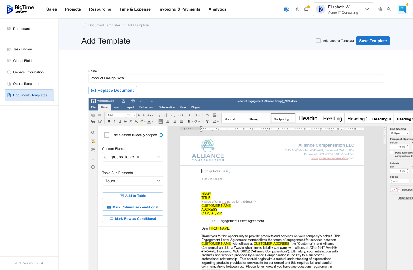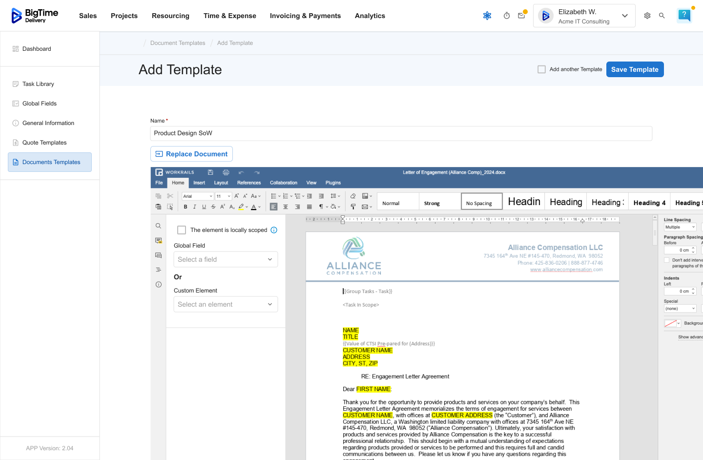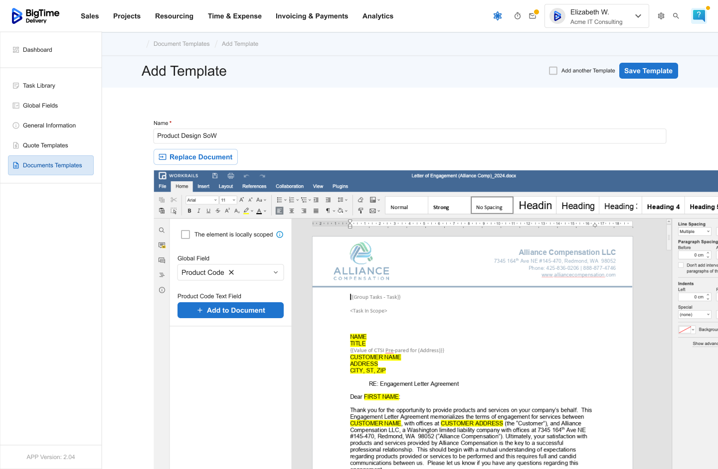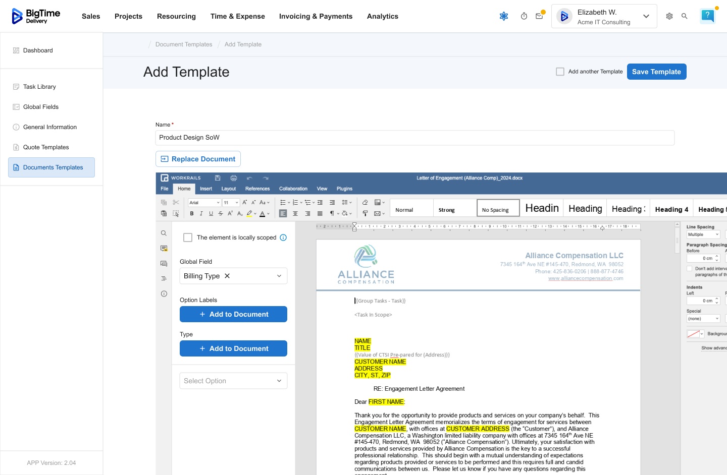 Document Templates define the client-facing layout of your quotes and proposals in BigTime. They transform structured quote data — including Tasks, Global Fields, and General Information — into professional, branded documents that are ready to share with clients.