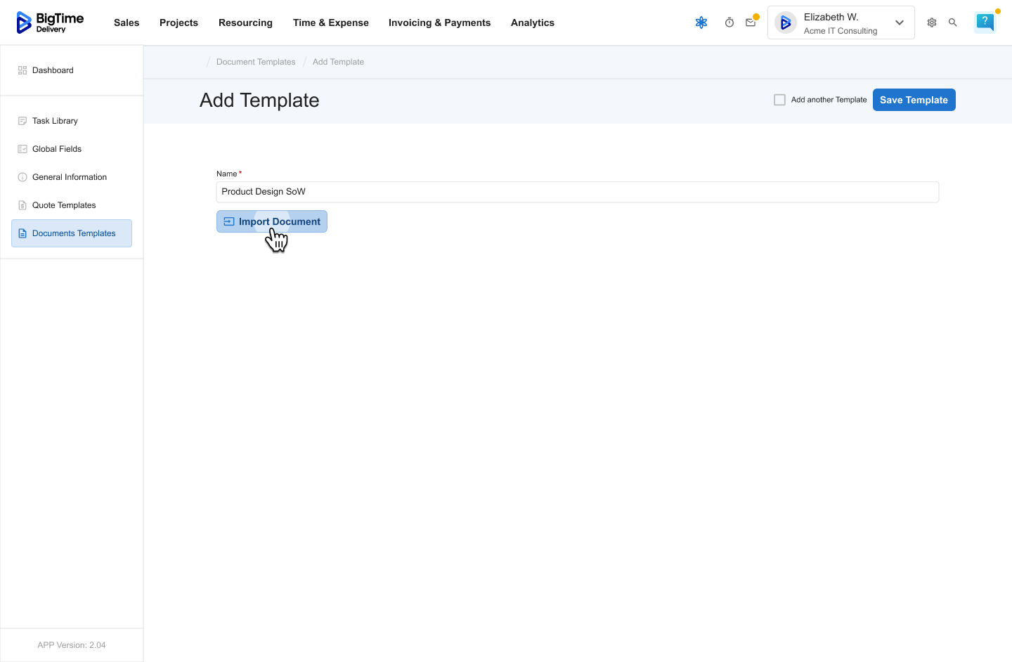 To get started, you must import an existing branded document into BigTime — for example, your firm’s proposal or statement of work layout.