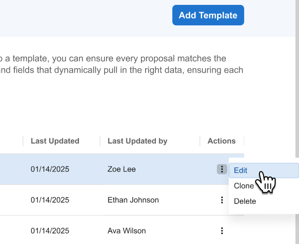 - Actions – A three-dot menu that lets you manage each template. From here, you can Edit, Clone, or Delete the selected template.