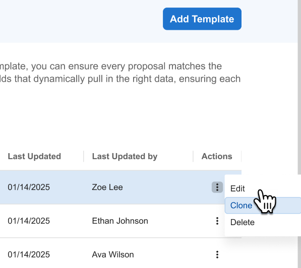 To do this, click the three-dot menu (⋮) next to the template you want to copy and select Clone.