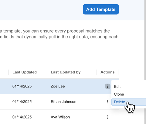 To delete a template, click the three-dot menu (⋮) next to the template name in the Document Templates List and select Delete.