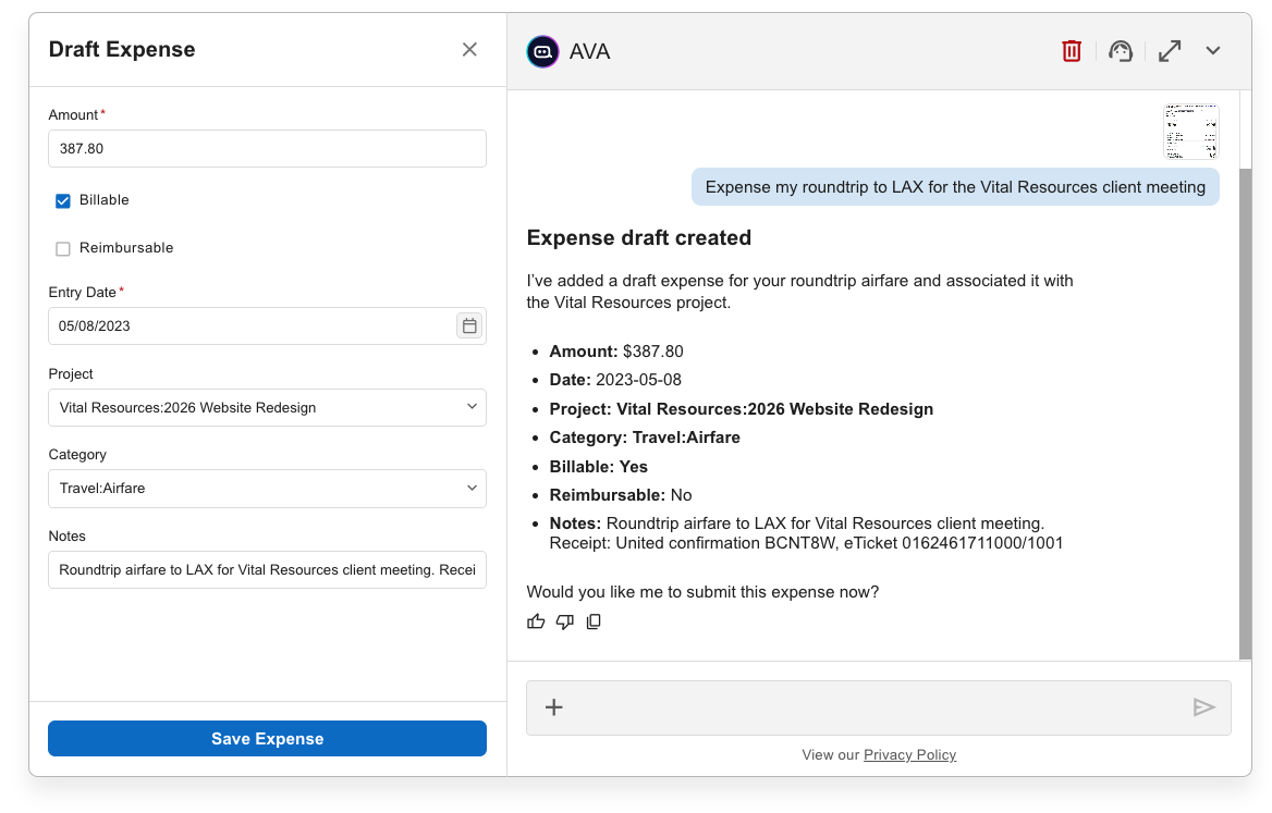 For both new and updated expenses, AVA always shows a review step before finalizing changes. You must confirm the expense details before they are saved.