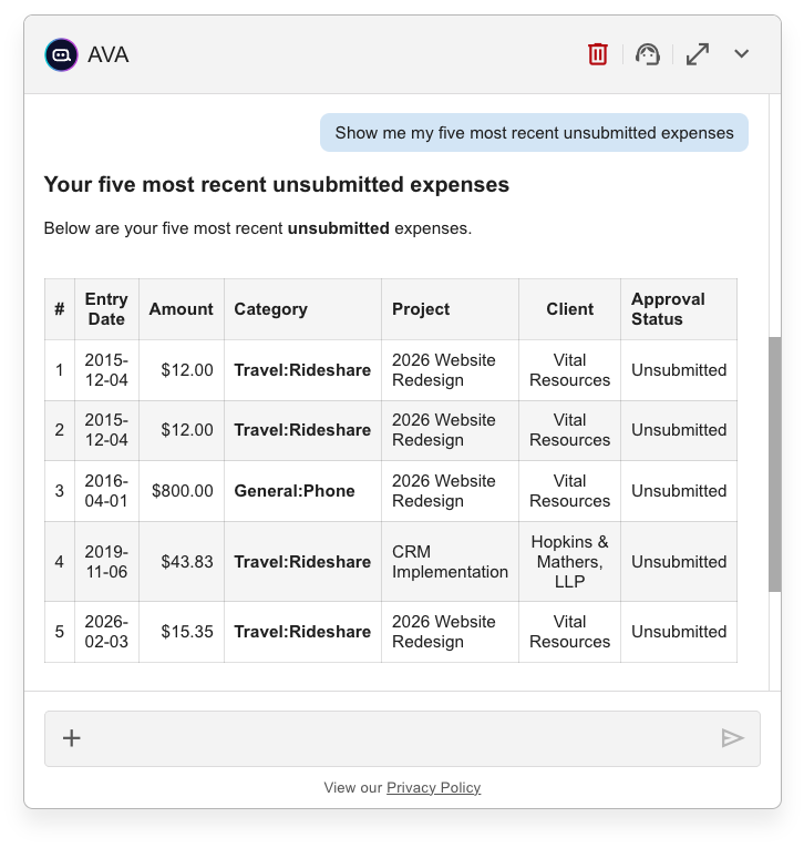You can ask AVA to display expense information directly within the chat interface.
